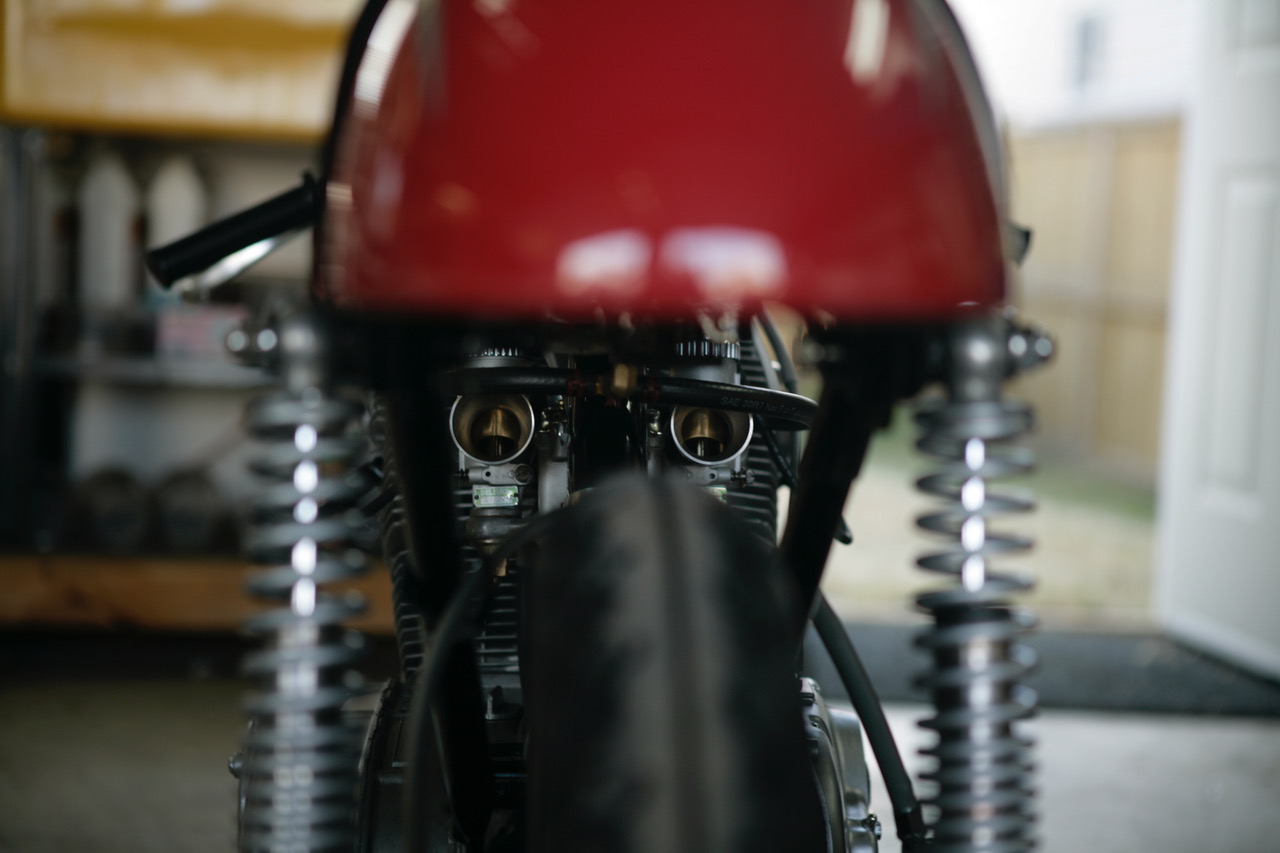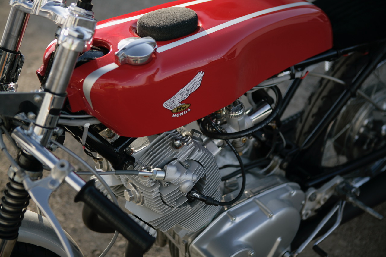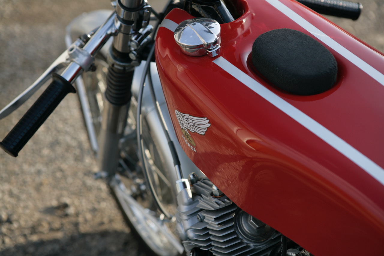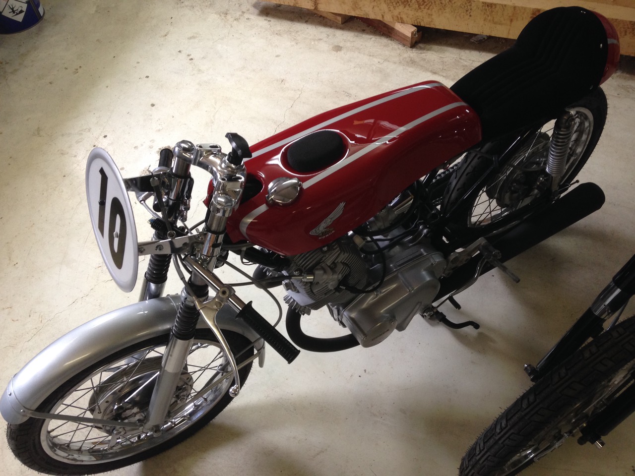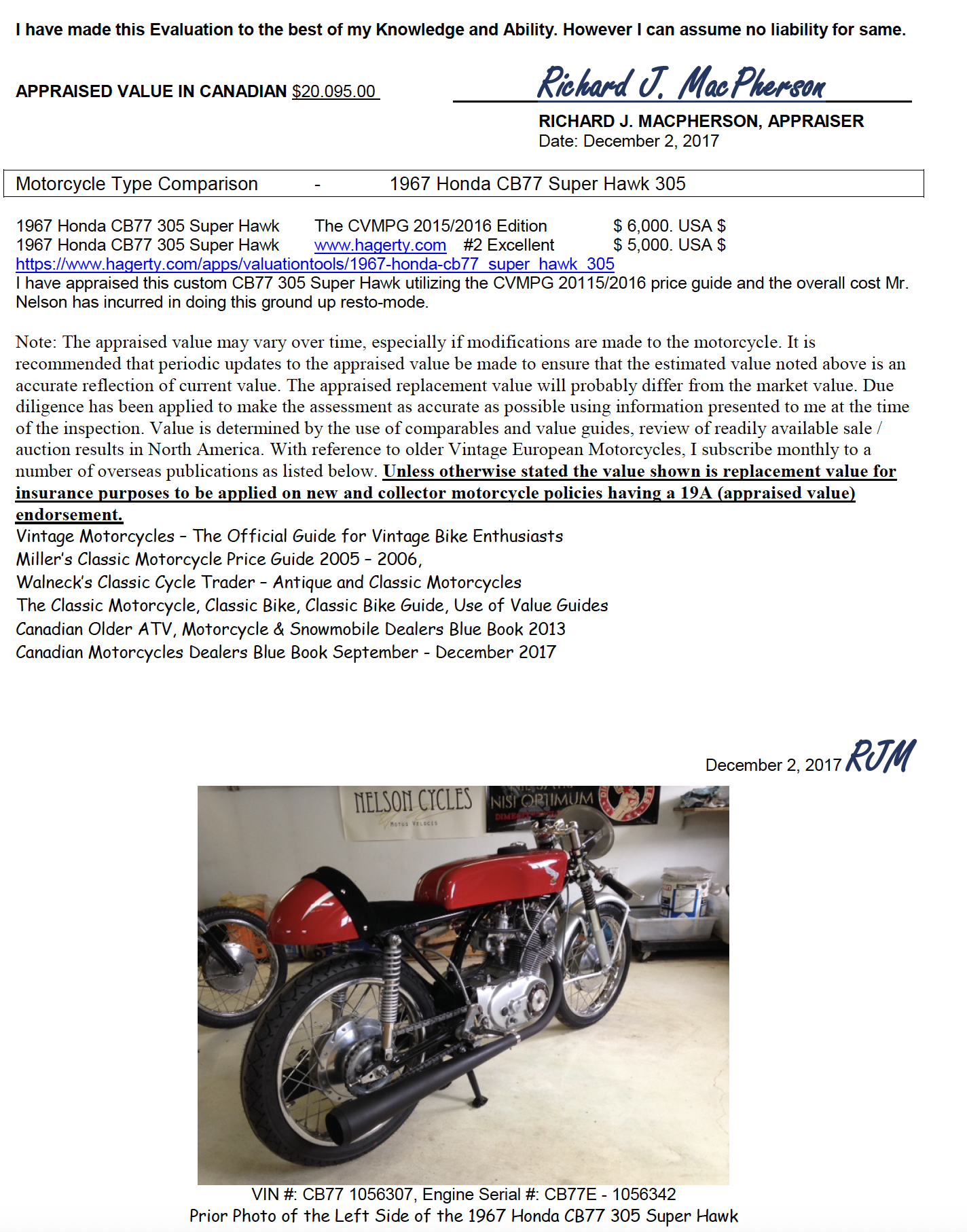 This is a numbers matching (frame and engine SN), 1967, CB77, 305 Superhawk, which was built with all original, NOS and period original parts, inspired by the Honda RC163 factory team racer. Literally every nut and bolt has been refurbished and assembled from a parts list. The tank and seat are hand made aluminum from Holt Works in England, copied from an original RC163 tank and seat. The seat is suede covered and stitched to match the original, and the paint, stripes and badges also match exactly. The engine is bored 4 over, with a MegaCycle “TT” cam, NOS Italian high compression pistons, Delorto SS1 carbs from a 1967 Ducati GP race bike, hand made steel reverse cone open pipes in matte black, and hand made stainless mufflers for the street-both from Cone Engineering in California. Three angle valve grind, ported heads, hand made aluminum intakes, and high tension valve and clutch springs. The wiring harness is hand made from scratch, and includes wiring for headlight, tail light, horn and starter, for street use, if desired. New brakes, bearings, seals, race compound tires, lithium battery. The bike is currently push start. The kick starter comes with but the pin needs to be replaced as the compression is too great for the original pin. An original electric starter could be installed, but does not come with the bike. The bike fits a short rider as is, but would benefit from rear set pegs. The bike has been run twice, but never ridden. Comes with slides and jets for tuning, and a selection of spare parts. The professional appraisal, shop manual and parts manual are also available. Photo record of the build is also available. Appraised at $20,000 CAD “the bike shows as a 10 out of 10 if being judged", the bike cost $14,000 CAD in parts, plus 200 hours of labour to build.